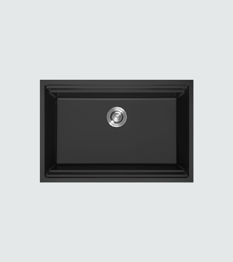 Single bowl sink with 2 layer step made of artificial stone high temperature resistance and easy-to-clean round inner corners.