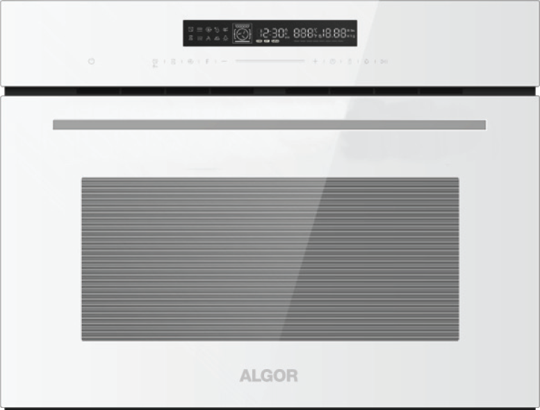 Description: Algor multi-functional microwave oven/grill in a sleek white glass design with a 50 liters capacity. Ideal for cooking, heating, and grilling, it provides browning, searing, and grill marks on all types of food.