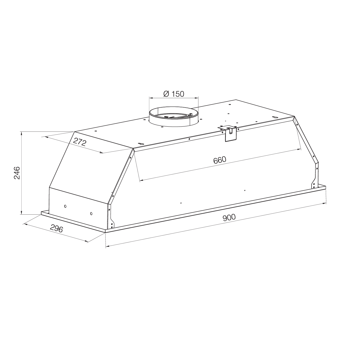 90 cm under-cabinet cooker hood with a stainless steel panel and galvanized housing. This model is designed to fit seamlessly under cabinets while providing effective ventilation.