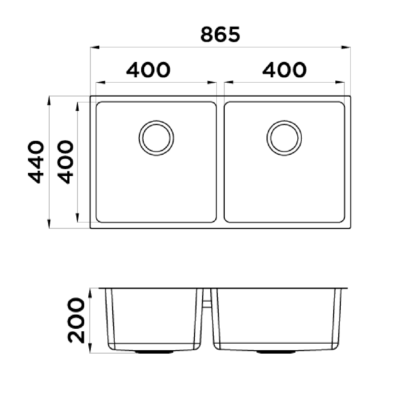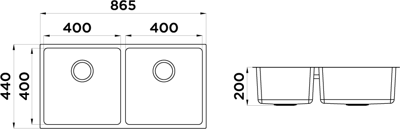 • Cutout Undermount: 828 x 403 mm x R20