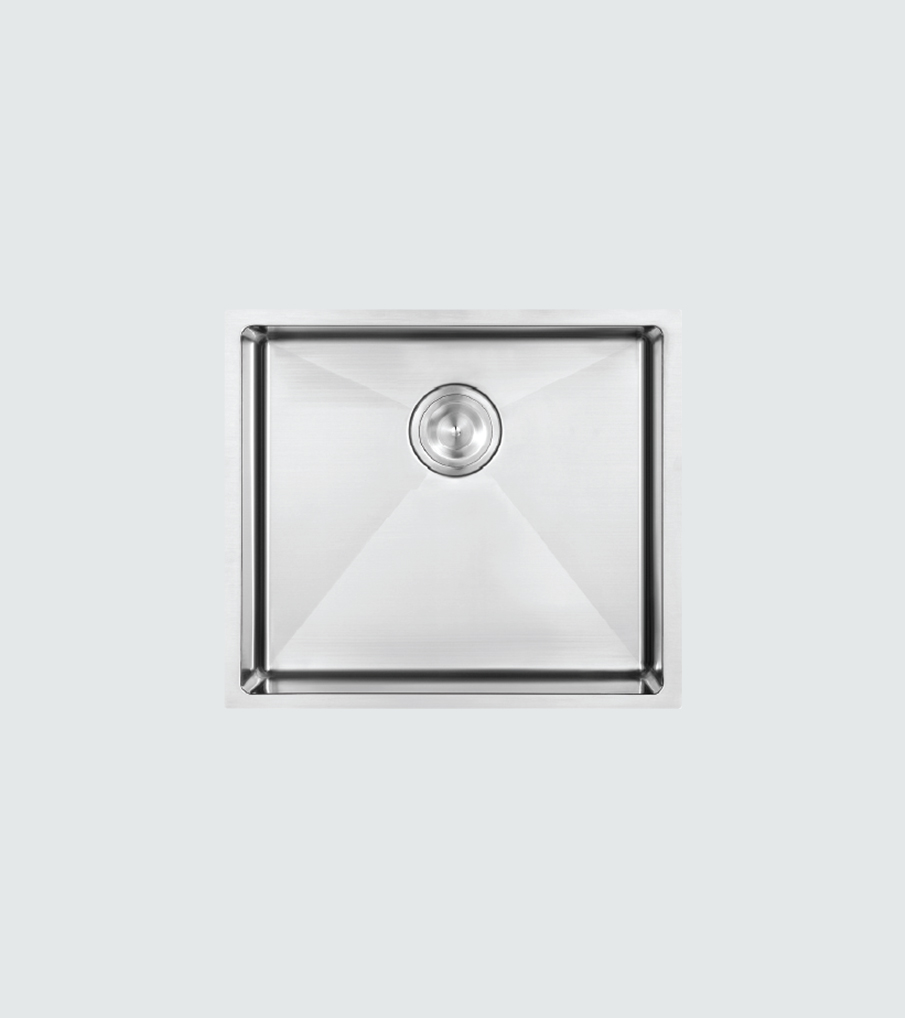 The Algor AUM550-45GM is a single bowl sink made from SS304 stainless steel, featuring a sound pad and undercoating. It has a 1.2 mm thickness and a brushed surface finish, making it practical for washing large pots and pans.